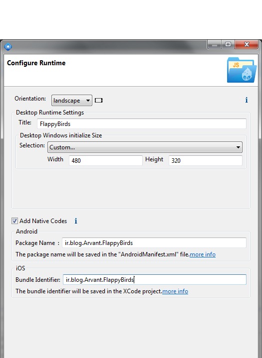 در پنجره بعدی شما می توانید مشخصات کلی کلی پروژه را انتخاب کنید .در صورتی که تمایل به اجرای بازی بر روی پلتفرم های Android , iOS را دارید با فعال کردن گزینه Add Native Codes مشخصات مربوط به بسته ایجاد شده را وارد کنید .(هر بسته اجرایی در این سیستم عامل ها دارای یک نام منحصر به فرد است که معمولاَ در قالب آدرس اینترنتی مشخص می شود )