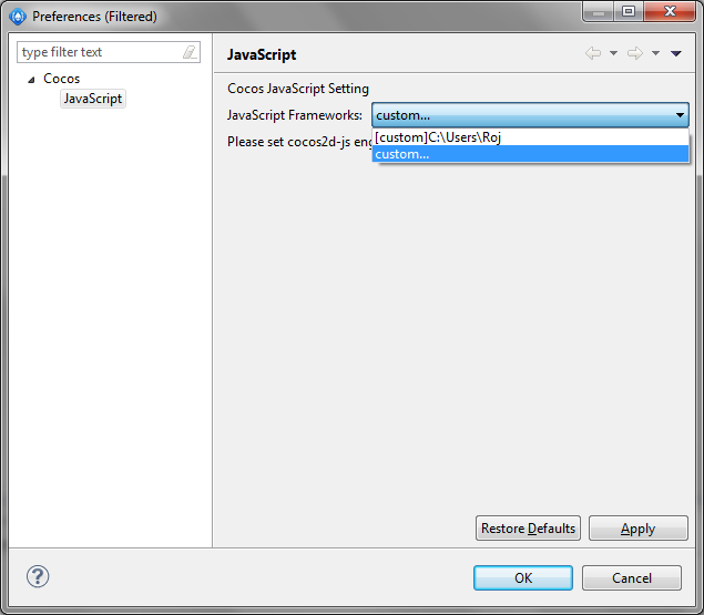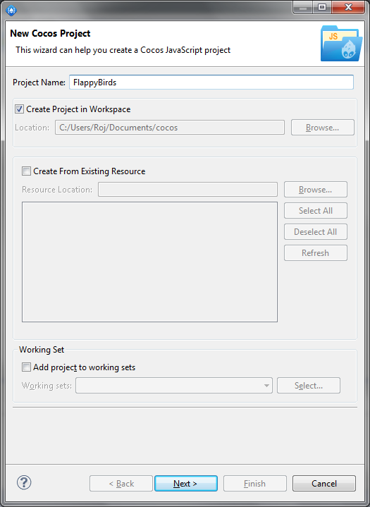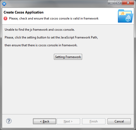 در هنگام ایجاد اولین پروژه شما نیاز دارید تا مسیر cocos2d-x js را معرفی کنید برای این کار کافی است در پنجره شکل زیر روی گزینه Setting FrameWork کلیک کنید .